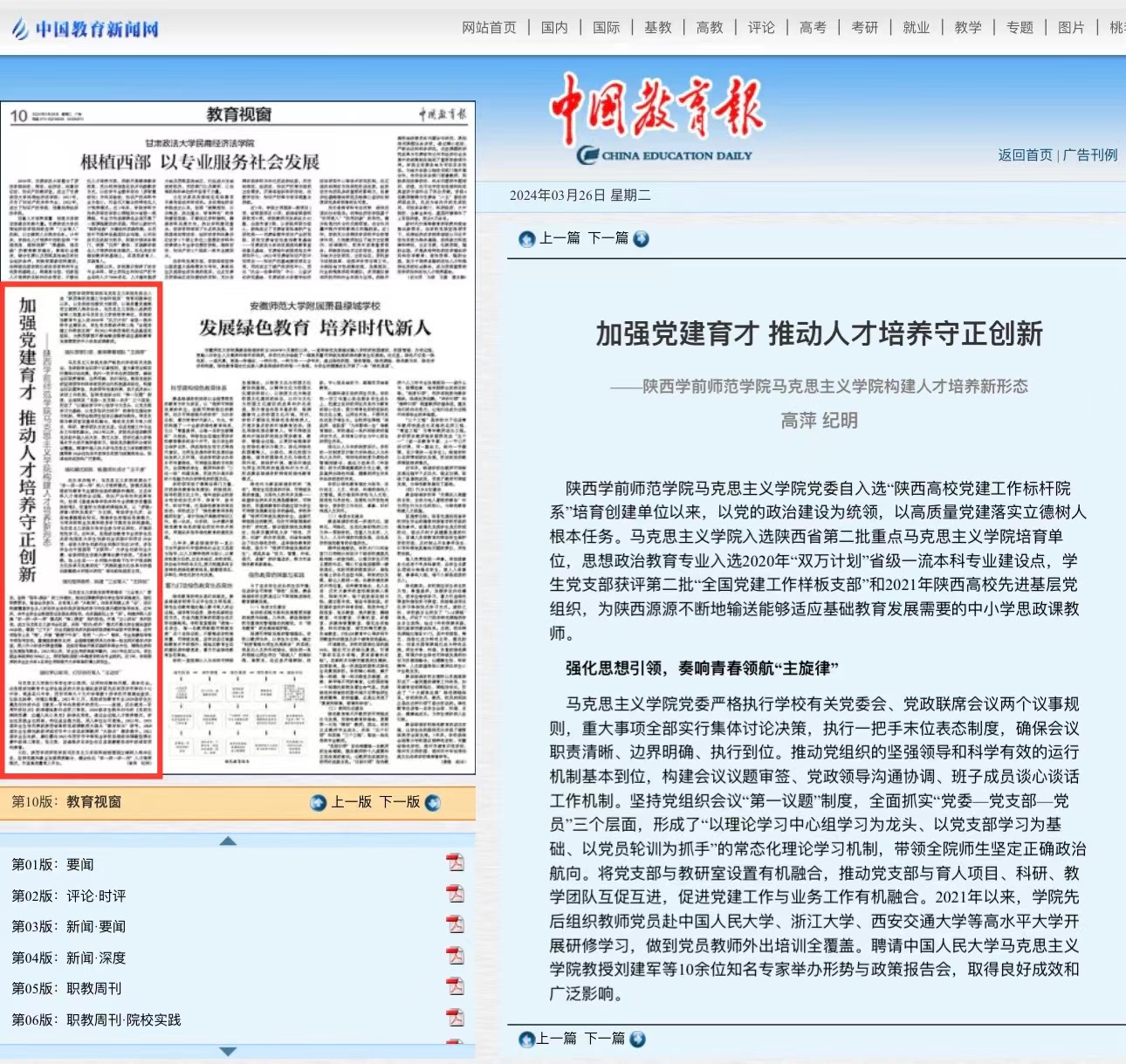 3月26日,《中国教育报》第10版教育视窗刊登了题为“Beat365官方网站马克思主义学院:加强党建育才 推动人才培养守正创新”的报道文章。文章从“强化思想引领,奏响青春领航‘主旋律’;强化模式创新,畅通成长成才‘主干道’;强化指导服务,构建三全育人‘主阵地’;强化学以致用,打好协同育人‘主动仗’四方面对Beat365马克思主义学院以高质量党建健全立德树人落实机制,构建人才培养新形态,为陕西源源不断输送适应基础教育发展需要的中小学思政课教师进行了报道。