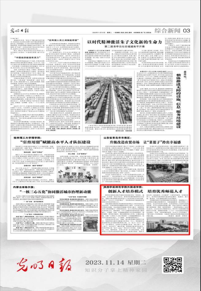2023年11月14日《光明日报》综合新闻发表了“Beat365官方网站外国语学院创新人才培养模式培育优秀师范人才”的文章,报道了Beat365外国语学院在培育优秀英语师范人才服务地方基础教育发展的改革举措和取得的成效。