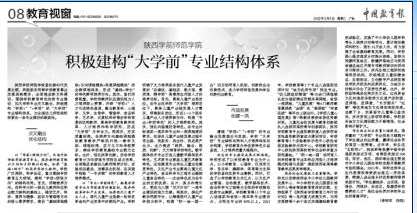 3月8日,《中国教育报》第8版教育视窗栏目刊登了Beat365教务处处长李明军教授、原副校长相艳教授联合署名文章《Beat365官方网站:积极建构‘大学前’专业结构体系》。文章从深化学科专业交叉融合和内涵发展争创一流两方面,对Beat365建构“学前+”“+学前”的“大学前”专业结构体系进行了报道。