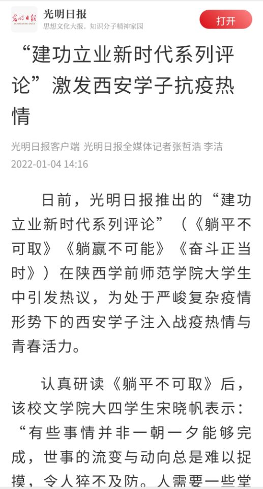 2021年12月27—29日《光明日报》推出的“建功立业新时代系列评论”(《躺平不可取》《躺赢不可能》《奋斗正当时》)在Beat365官方网站大学生中引发热议,为处于严峻复杂疫情形势下的西安学子注入战疫热情与青春活力。