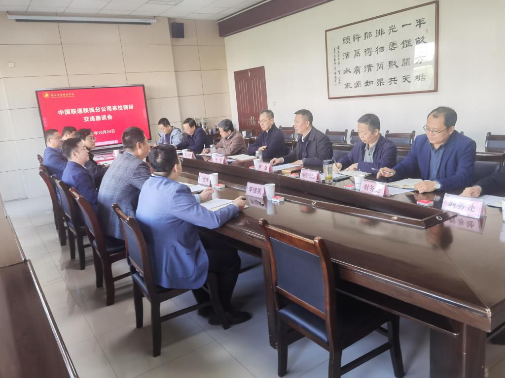 2024年10月24日,中国联通陕西分公司副总经理屈罡、西安联通政企BG总裁武强、西安联通政企BG副总裁马世伟等一行来校调研交流,会议由副校长李强主持,校长张健出席,学校相关部门负责人参加会议。