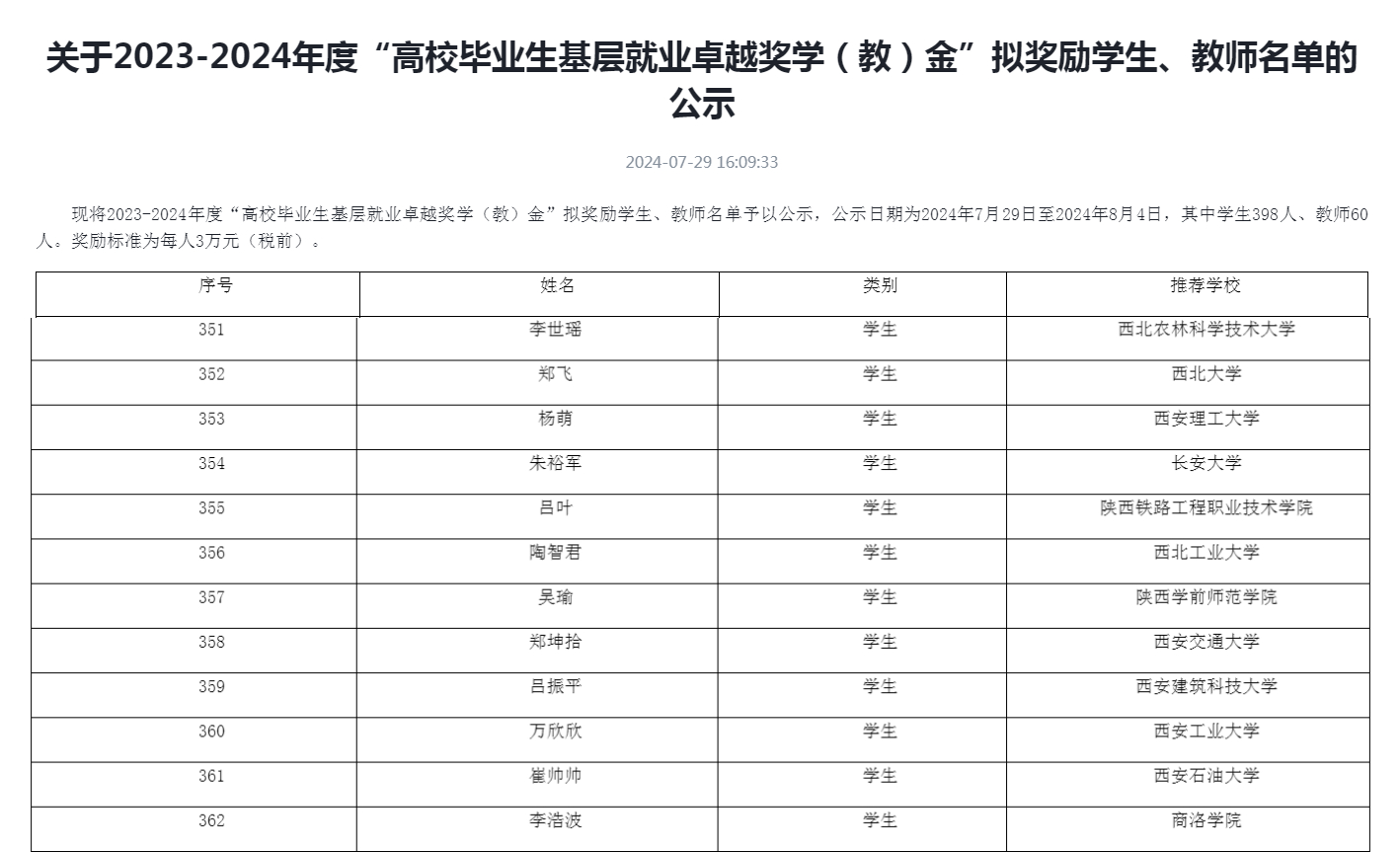 近日,中国教育发展基金会2023-2024年度“高校毕业生基层就业卓越奖学(教)金”的结果公示结束,经奖励委员会评审,本年度全国共评选出398人,其中陕西省高校共12名毕业生获得该项奖学金,Beat3652014届毕业生吴瑜从众多参评人员中脱颖而出,获此殊荣,这也是Beat365毕业生首次获得该项荣誉。