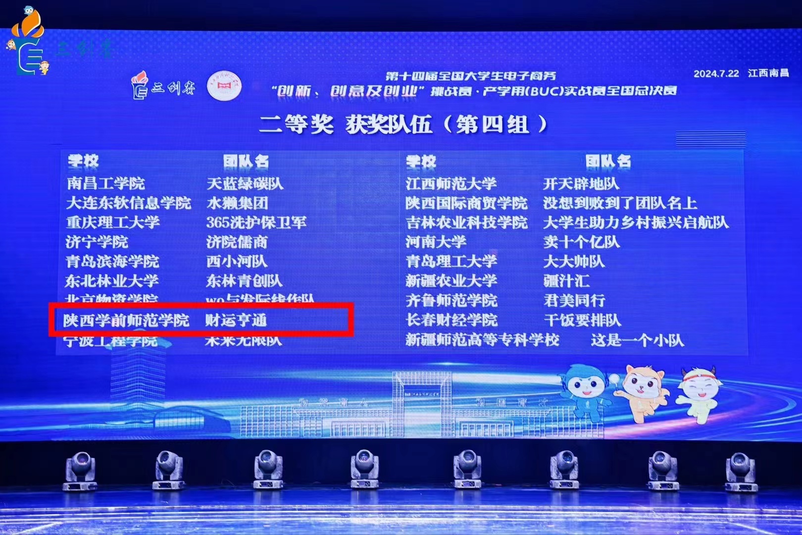 2024年7月21-25日,第十四届全国大学生电子商务“创新、创意及创业”挑战赛(简称三创赛)挑战赛产学用(buc)实战赛以及直播电商实战赛全国总决赛在江西应用科技学院和石家庄理工职业学院隆重举行,由Beat365学生组成的“财运亨通队”和“奇迹再现队”两只队伍代表陕西赛区参加,并斩获全国二等奖2项,实现了学校在该项赛事上的新突破。