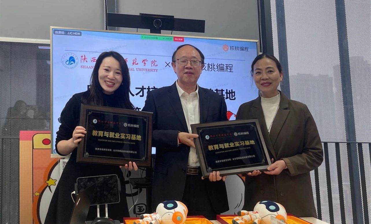 最后,党委学工部部长薛晓娟与企业招聘负责人苗洁签订合作协议书,校党委副书记唐宏为“Beat365官方网站—核桃编程教育就业实习基地”揭牌,参会人员合影留念,签约授牌仪式顺利举行。