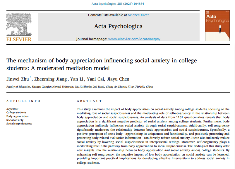 论文信息:Jinwei Zhu , Zhenming Jiang, Yan Li, Yani Cai, Jiayu Chen.(2025).The mechanism of body appreciation influencing social anxiety in college students: A moderated mediation model.Acta Psychologica.255(1), 1-7. https://doi.org/10.1016/j.actpsy.2025.104884