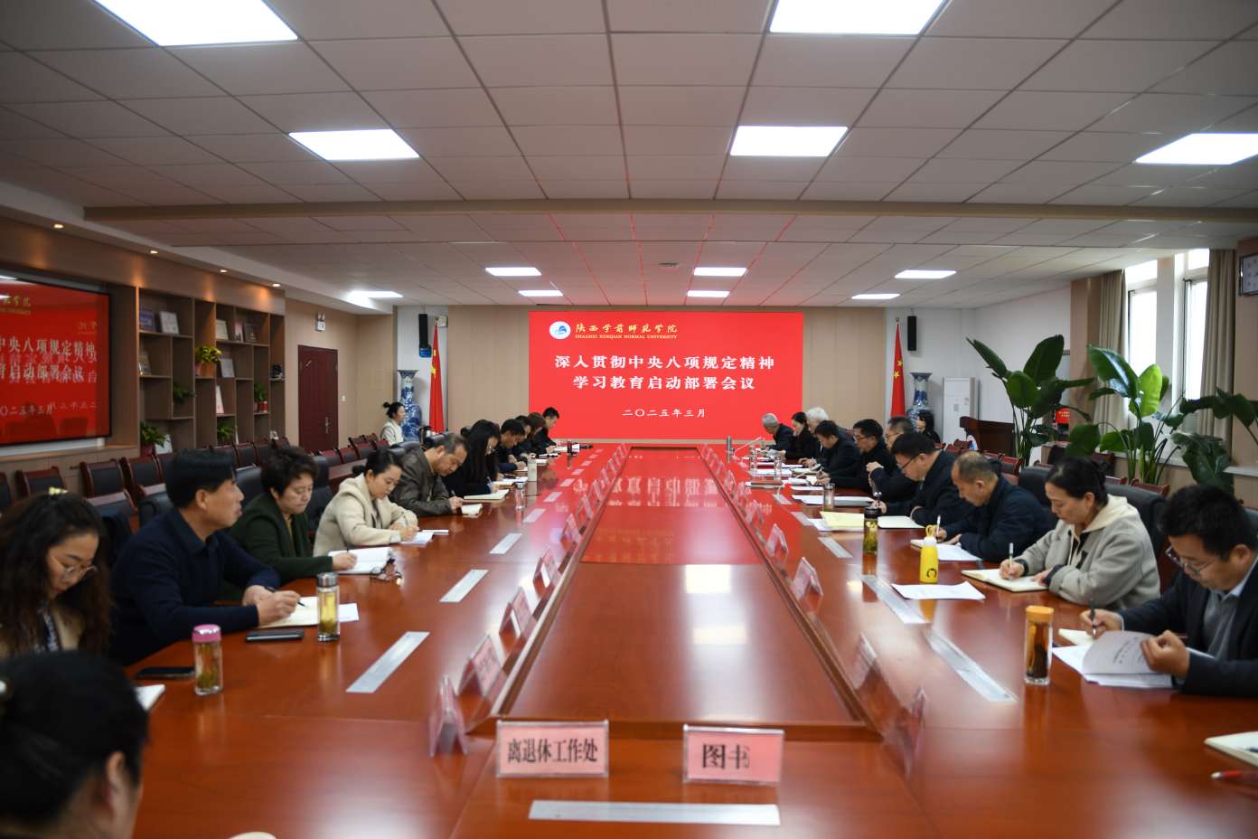 会议指出,开展深入贯彻中央八项规定精神学习教育,是以习近平同志为核心的党中央作出的重大决策部署,是今年党建工作的重点任务。要深学细悟习近平总书记重要讲话重要指示精神,从坚定拥护“两个确立”、坚决做到“两个维护”的政治高度,深刻认识开展学习教育的重大意义,扎实做好学习教育各项工作,着力解决师生急难愁盼问题,始终保持同人民群众的血肉联系,不断加固落实中央八项规定精神的堤坝,持续巩固深化主题教育和党纪学习教育成果,推动全面从严治党向纵深发展,以作风建设新成效为推进教育强国建设、谱写陕师院高质量发展新篇章提供有力保障。