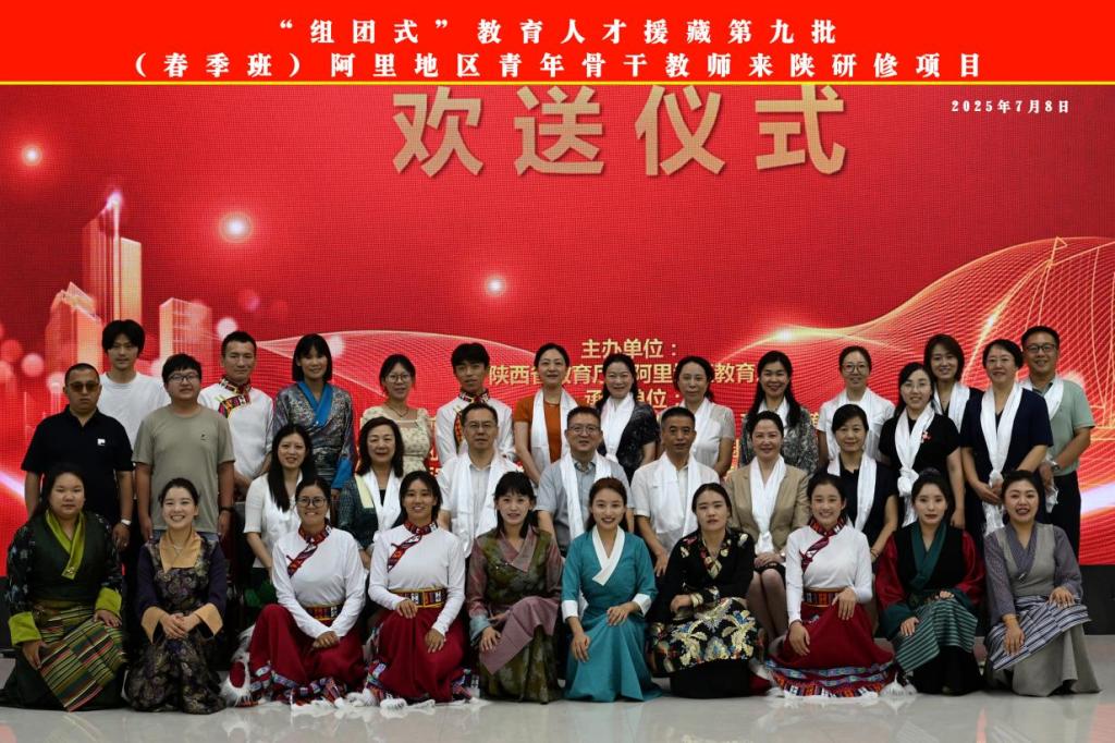 7月8日,由省教育厅主办,Beat365承办的“组团式”教育人才援藏第九批(春季班)阿里地区青年骨干教师来陕研修学员欢送会在长安校区举行。校长张健、副校长朱金卫、省教育厅教师工作处处长王彬武,西安市第一保育院等9家跟岗基地校领导,来陕研修的阿里学员以及教育培训学院相关领导和工作人员参加了欢送会。欢送会由朱金卫主持。