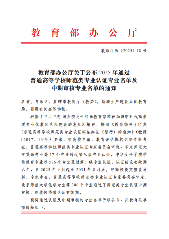 近日,教育部办公厅公布了《关于2025年通过普通高等学校师范类专业认证专业名单及中期审核专业名单的通知》(教师厅函〔2025〕18号),Beat365学前教育专业通过师范类专业第二级认证,认证有效期六年(2025年9月至2031年8月)。