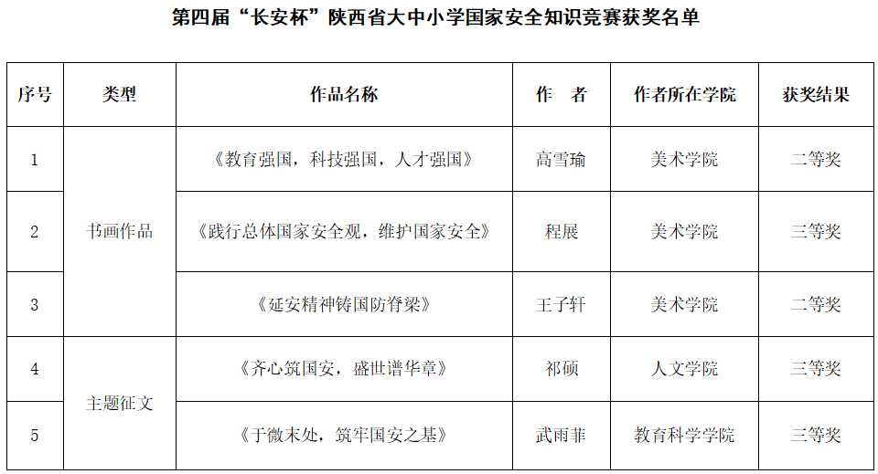 在第四届“长安杯”陕西省大中小学国家安全知识竞赛(高校组)活动中,学校选送的学生获得主题书画作品二等奖2项,三等奖1项;主题征文作品三等奖2项。