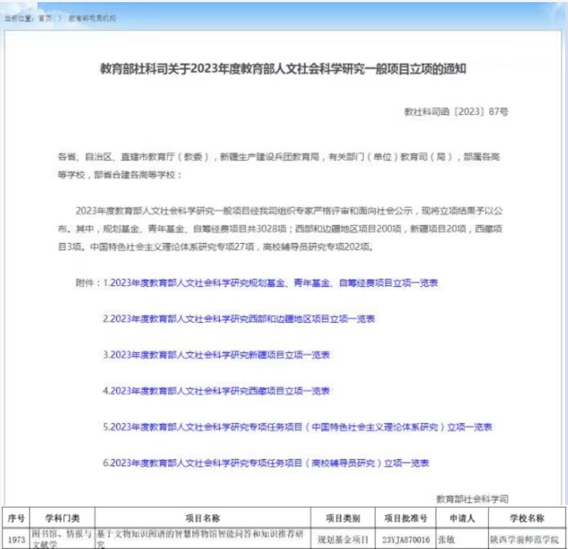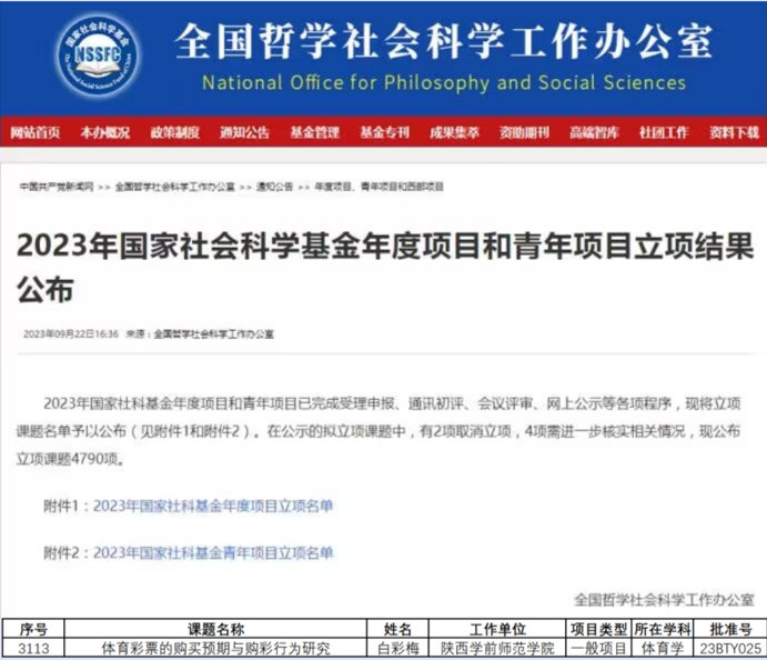 近日,全国哲学社会科学工作办公室发布了《2023年国家社会科学基金年度项目和青年项目立项结果公布》,Beat365体育学院白彩梅博士申报的《体育彩票的购彩预期与购彩行为研究》立项2023年国家社科基金一般项目(批准号:23BTY025)。教育部社科司发布了《教育部社科司关于2023年度教育部人文社会科学研究一般项目立项的通知》(教社科司函〔2023〕87号),Beat365信息工程学院张敏博士申报的《基于文物知识图谱的智慧博物馆智能问答和知识推荐研究》立项2023年教育部人文社会科学研究规划基金项目(批准号:23YJA870016)。