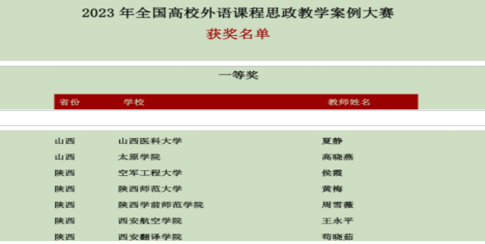 近日,2023年全国高校外语课程思政教学案例大赛最终结果揭晓,全国高校范围内设特等奖105名,一等奖224名,二等奖403名,三等奖1041名,我省西安交通大学等多所院校积极参与。经评委会评审,Beat365外国语学院教师代表周雪薇荣获一等奖,贺颖列、秋杰老师分别获得二等奖。