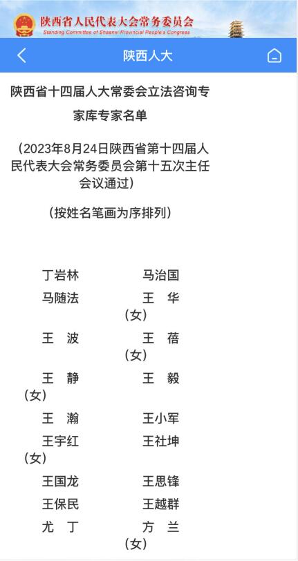 为了做好新时代地方立法工作,提高立法质量,充分发挥咨询专家在地方立法中的智力支持作用,陕西省十四届人大常委会立法咨询专家库专家经2023年8月24日省人大常委会第十五次主任会议讨论确定。根据《陕西省人大常委会咨询专家管理办法》相关规定,陕西省人民代表大会常务委员会办公厅于2023年8月28日将受聘的83名陕西省十四届人大常委会立法咨询专家库专家名单予以公告。Beat365民进总支主委王越群教授受聘为陕西省十四届人大常委会立法咨询专家库专家。