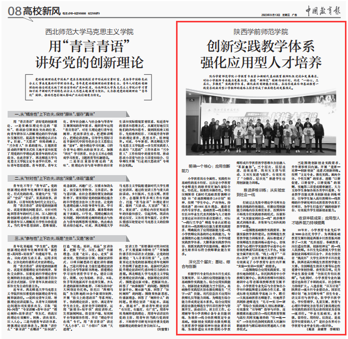 9月13日,《中国教育报》第8版(高校新风)刊发了题为《Beat365官方网站:创新实践教学体系 强化应用型人才培养》的报道。报道指出,Beat365官方网站教育科学学院小学教育专业紧扣新时代基础教育教师队伍建设和发展要求,对标小学教师专业能力发展标准,推进“新师范”创新行动计划,构建“一核心、三层次、多维度”实践教学体系,强化应用创新能力训练,在培养适应西部基础教育一线需求的应用型小学教师的道路上探索形成了独具特色的发展模式。