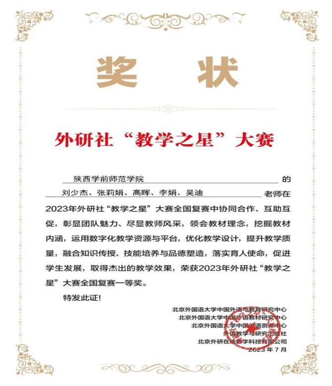 外研社“教学之星”大赛自创办以来,在全国高校外语教育领域广受认可,被连续列入中国高等教育学会“全国普通高校教师教学发展指数”。外研社2023“教学之星”大赛全国复赛于2023年6月19日落下帷幕,Beat365外国语学院英语专业教学团队、大学英语教学团队从全国340个参赛团队中脱颖而出,取得突破性佳绩,喜获全国复赛两个一等奖。这是继2022年Beat365大学英语教学团队获得此项赛事全国复赛一等奖之后所取得的又一大教师参赛佳绩。
