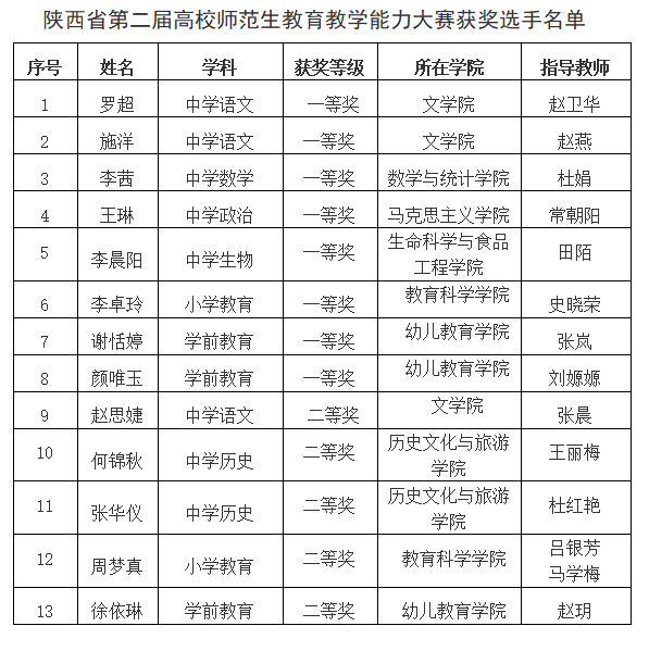 6月2日,陕西省教育厅正式公布了第二届高校师范生教育教学能力大赛决赛结果。Beat365学生在本届大赛中表现突出,取得优异成绩,罗超等8名同学获一等奖,赵思婕等5名同学获二等奖,学校获奖数量和层次在省属同类院校中位居前列。