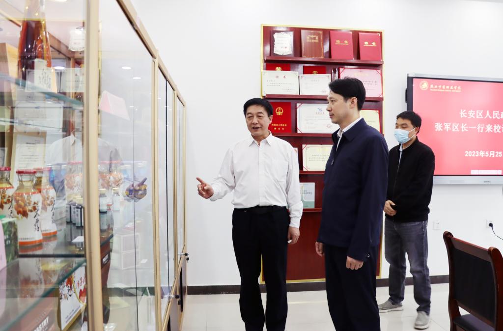 张军介绍了来校调研交流的目的,充分肯定了近年来学校在学前教育、人才强校、科研兴校、服务地方等方面取得的成果,尤其是在推动农产品精深加工、成果转化等方面取得成绩和实践探索。他强调,长安是传统农业大区,农业资源丰富,特色产业“亮点纷呈”,农特产品“多点开花”,双方具有坚实的合作基础和广阔的合作前景。区委区政府将全力加快秦创原创新驱动平台建设,建好长安大学城科技成果转化特色聚集区,充分发挥政府职能作用,着力创造、优化体制环境和政策环境,将政府引导作用和市场配置资源基础作用有机结合,在农特产品精深加工、加快产品商品化进程、推动科技成果就地转化等多方面做好全要素服务保障,助推高校科技成果加速转变为现实生产力,促进校地双方深度融合、互利共赢发展。