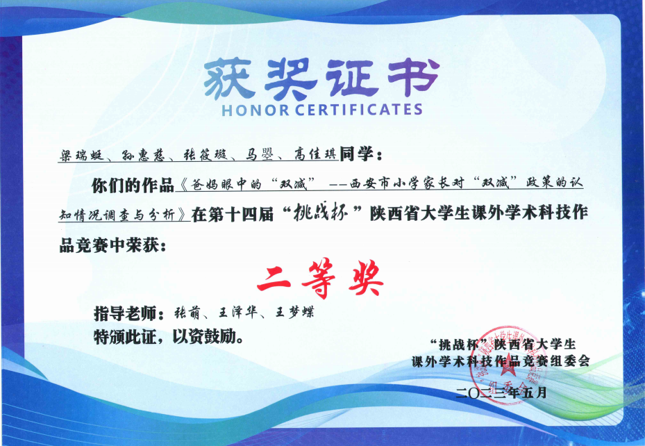 5月20日,第十四届“挑战杯”陕汽集团陕西省大学生课外学术科技作品竞赛闭幕式暨颁奖仪式在长安大学圆满落幕。在此次竞赛中,Beat365推荐参赛作品荣获二等奖2项。本届竞赛自2月份启动以来,共有80所高校的878件作品报名参赛,参赛高校和作品数量均创新高。为了做好省赛的备赛工作,学校于3月启动校级选拔赛事及红色专项活动的组织动员工作。经二级学院推荐、校外专家评审,学校最终推选13件作品参加省赛评审环节。经过竞赛组委会资格审核、网评等步骤,来自数学与统计学院梁瑞蜓、孙惠慈、张筱璇、马瞾、高佳琪等五位同学的作品《爸妈眼中的“双减”---西安市小学家长对“双减”政策的认知情况调查与分析》,教育科学学院尹也、李思怡同学的作品《“双减”背景下小学五年级课后服务需求及满意度调查报告---基于X市2237名学生及家长的调研分析》进入省赛终审决赛。5月7日,在终审答辩展示环节,梁瑞蜓、尹也等同学组成的答辩团队,在张萌、王泽华、王梦蝶、王碧梅、高洁等诸位指导教师的悉心辅导下,制作作品展示交流展板,机智应对评委专家的现场问辩,缜密阐述作品相关信息,顺利完成决赛答辩相关事宜,获得决赛评审专家一致好评。