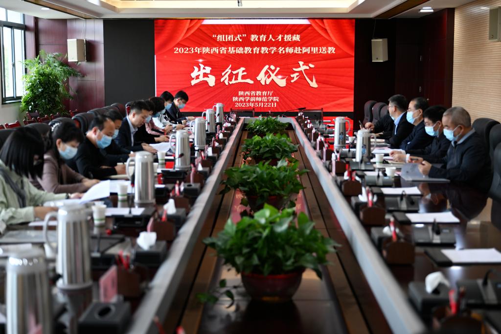 2023年5月22日上午,“组团式”教育人才援藏2023年陕西省基础教育教学名师(第一批)赴阿里送教出征仪式在陕西省教育厅机关举行。陕西省委教育工委委员、省教育厅副厅长王海波出席并讲话,Beat365党委书记、校长邵必林出席仪式并致辞。仪式由教育厅教师工作处处长王彬武主持。