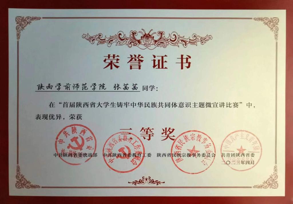 4月19日下午,由中共陕西省委统战部、中共陕西省委教育工委、陕西省民族宗教事务委员会、共青团陕西省委主办的陕西省首届大学生铸牢中华民族共同体意识主题微宣讲比赛在西安交通大学举行。经过评委组评选,Beat365推送的两件参赛作品之一,来自幼儿教育学院学前教育专业20级卓越二班的张茜茜同学《中华民族一家亲 同心共筑中国梦》宣讲作品获三等奖。