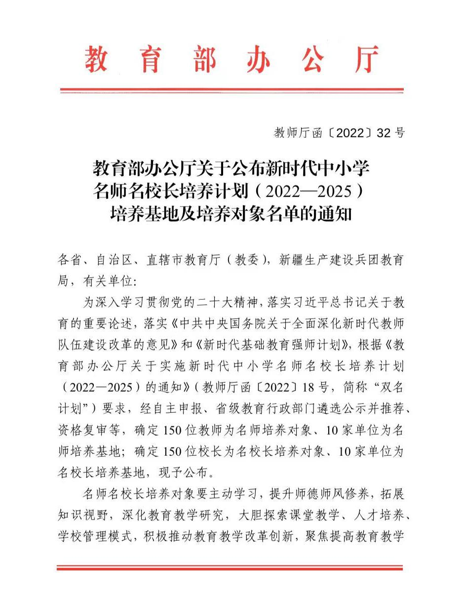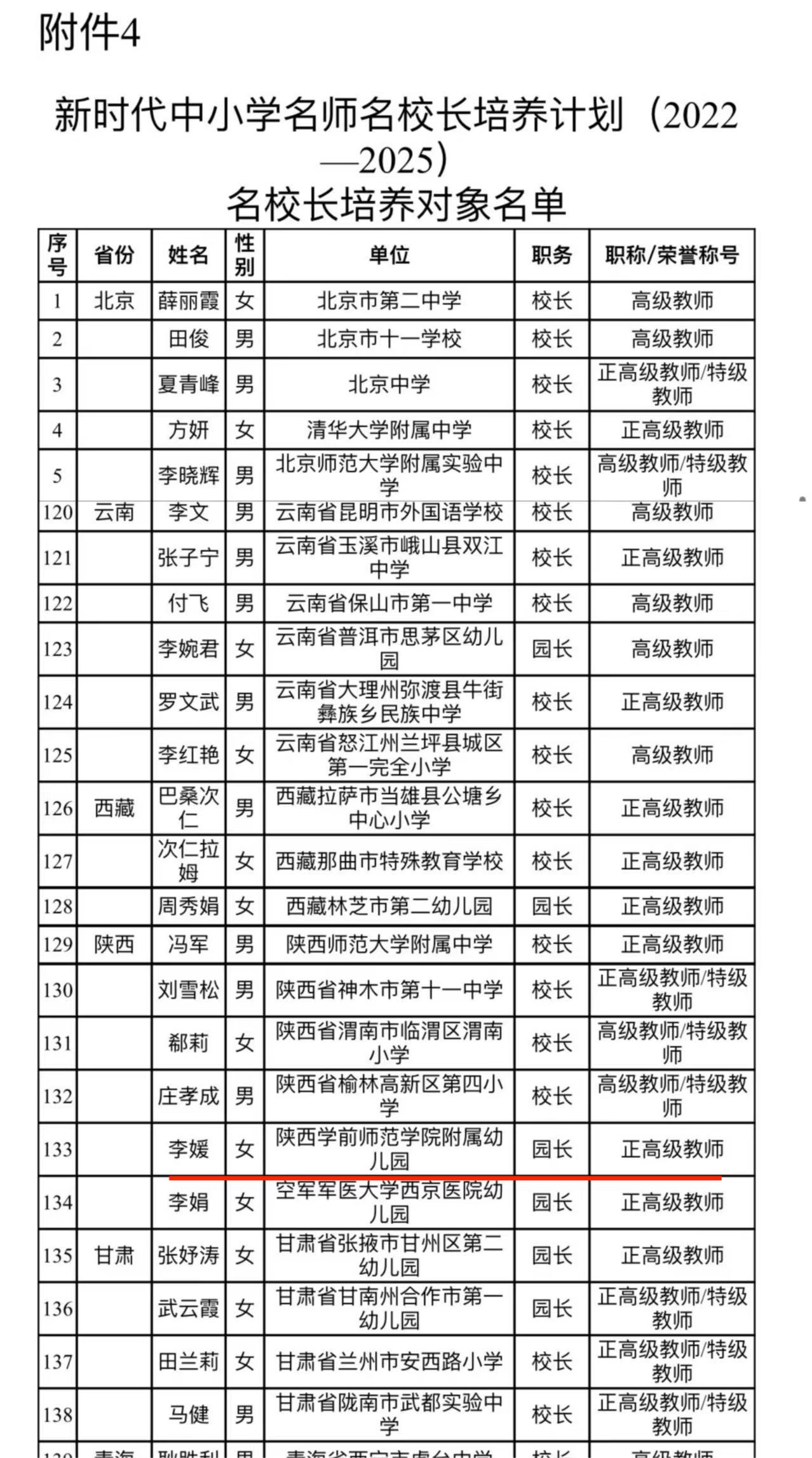 近日,教育部印发了《教育部办公厅关于公布新时代中小学名师名校长培养计划(2022-2025)培养基地及培养对象名单的通知》(教师厅函〔2022〕32号),陕西省教育厅在全省范围内共计遴选推荐了六名优秀校园长,Beat365附属幼儿园李媛园长为其中之一。