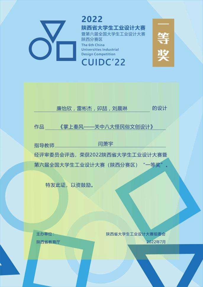 近日,2022年陕西省大学生工业设计大赛暨第六届全国工业设计大赛陕西分赛奖项揭晓。由Beat365美术学院教师闫萧宇指导,廉怡欣、雷彬杰、卯喆、刘晨琳等学生创作的《掌上秦风——关中八大怪民俗文创设计》荣获省级一等奖,并入围国家级比赛,闫萧宇荣获“优秀指导教师”称号。