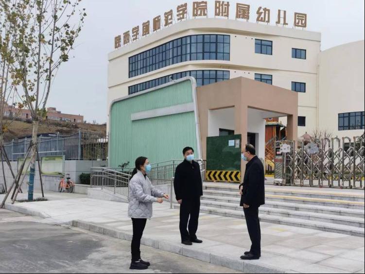 2022年11月21日上午,校党委书记、校长邵必林,副校长唐宏到学校附属幼儿园检查指导疫情防控工作,实地察看了幼儿园户外环境、班级活动室、厨房等区域疫情防控情况,听取了幼儿园负责人关于近期疫情防控措施、学生入园率、园区安全等情况汇报,对园区防疫工作给予了肯定,并对幼儿园近期疫情防控工作提出明确要求。