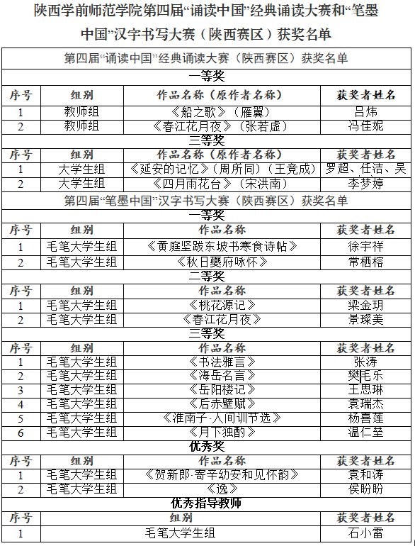 近日,陕西省教育厅公布了第四届中华经典诵写讲大赛(陕西赛区)评选结果。Beat365师生在“诵读中国”经典诵读大赛中喜获一等奖2项、三等奖2项,在“笔墨中国”汉字书写大赛中喜获一等奖2项、二等奖2项、三等奖6项、优秀奖2项,美术学院石小雷老师荣获优秀指导教师,学校荣获“优秀组织单位(诵读、书写)”,获奖数量、类型位居省属高校前列。