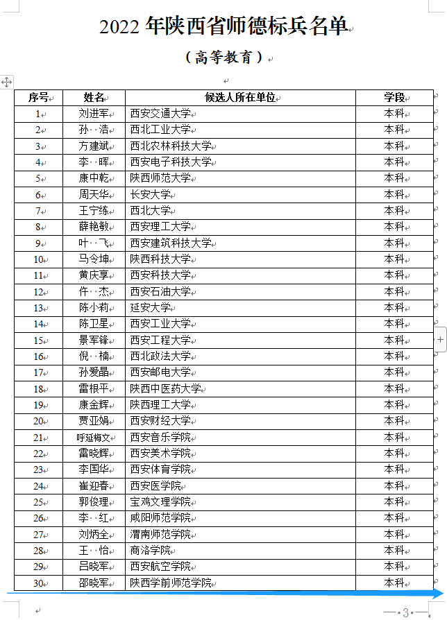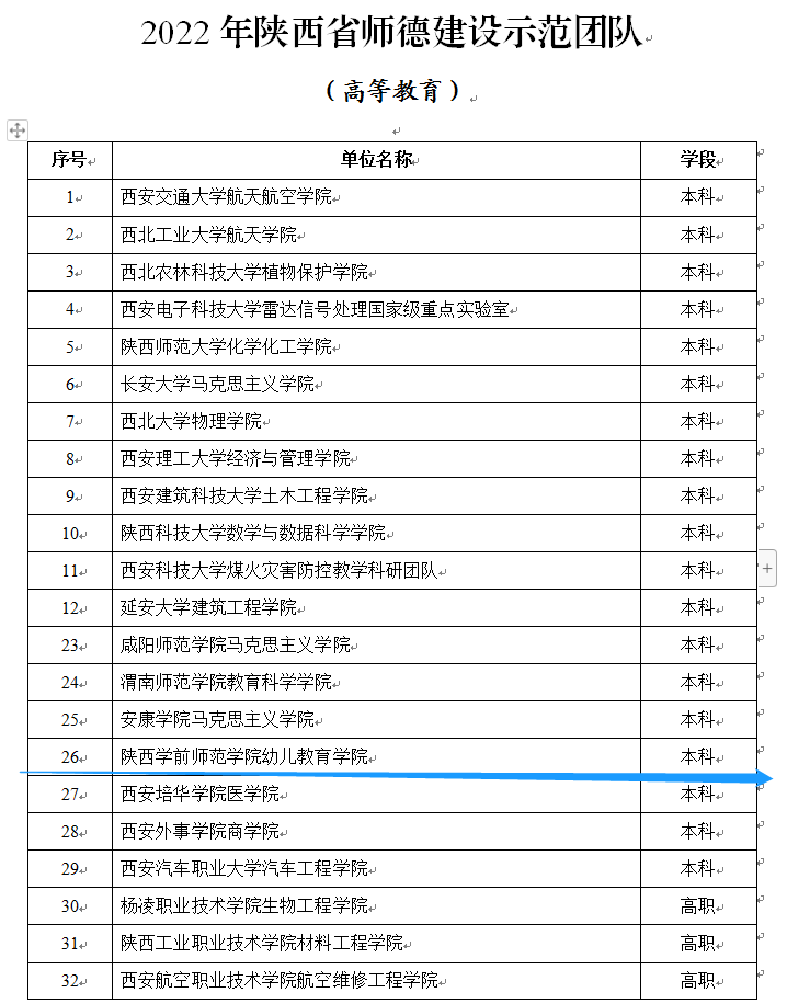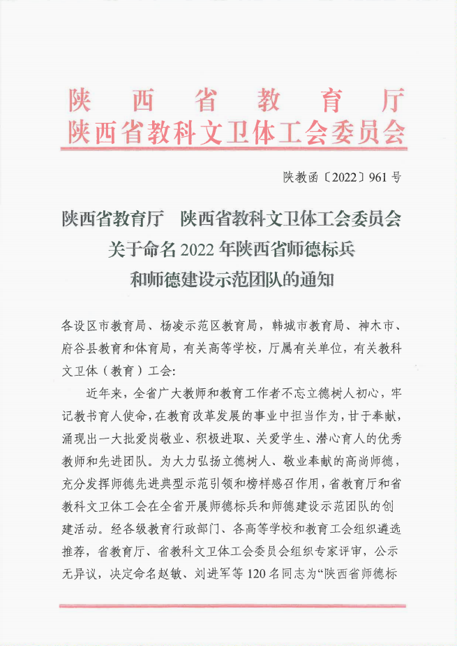 相关链接:陕西省教育厅 陕西省教科文卫体工会委员会关于命名2022年陕西省师德标兵和师德建设示范团队的通知
