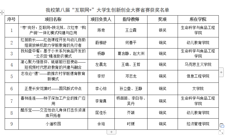 在省级决赛中,生命科学与食品工程学院《“枣”尚好:互联网+陕北残、次红枣 “购产销”一体化模式构建与应用》项目获得省赛银奖;幼儿教育学院《红苗助长——红色课程开发与幼儿自助组装放映机助力学前教育的先行者》等八个项目获得省赛铜奖。