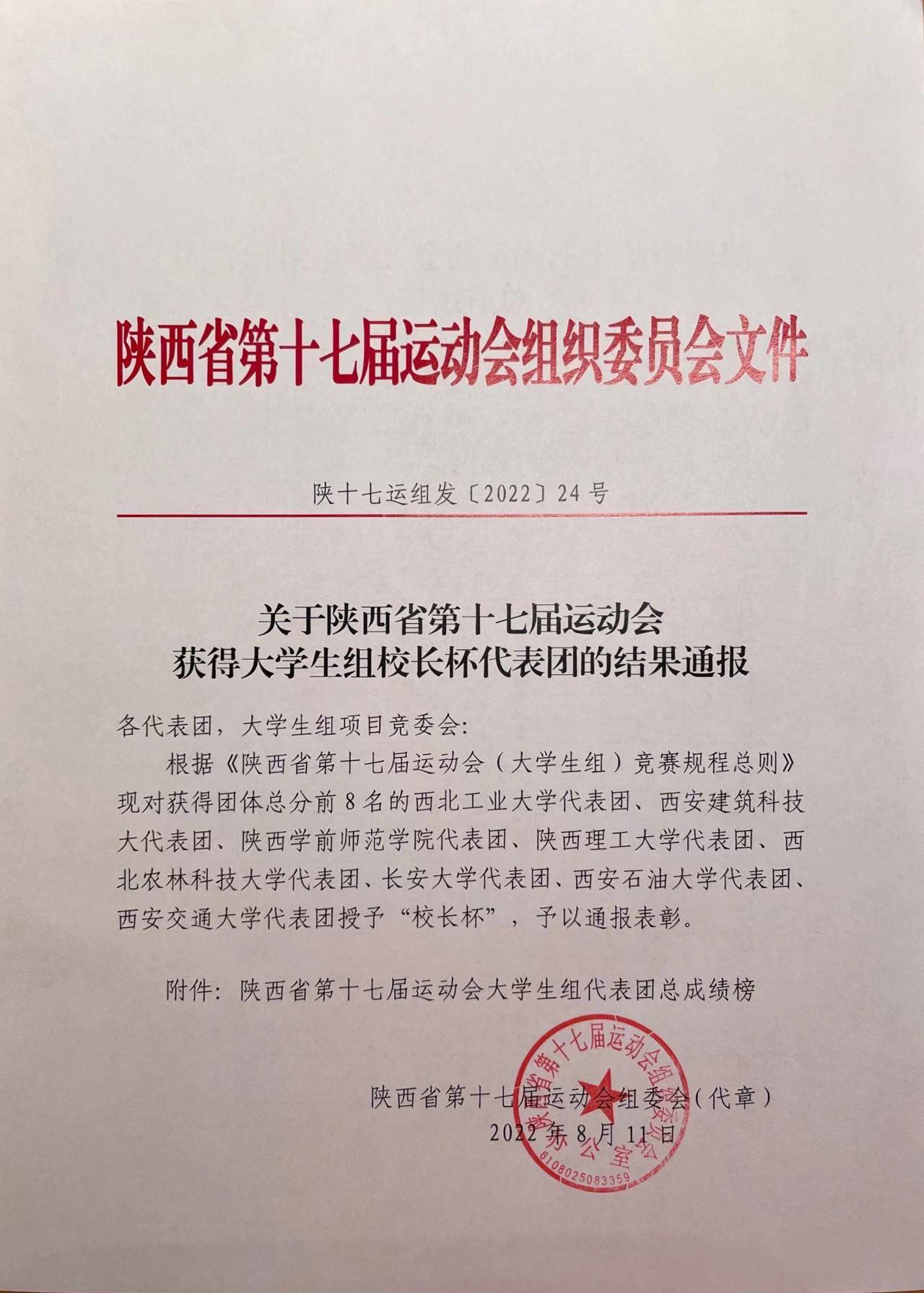 8月11日晚,陕西省第十七届运动会在榆林市体育中心圆满落下帷幕。本届运动会是陕西省参赛人数最多、办赛规模最大、项目设置最全的一届运动会,来自省内32所高校的1200名大学生参赛。Beat365官方网站以团体总分168分的优异成绩排名陕西省大学生组第三名,荣获“校长杯”和“体育道德风尚奖”。