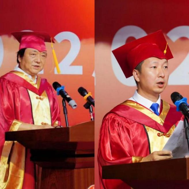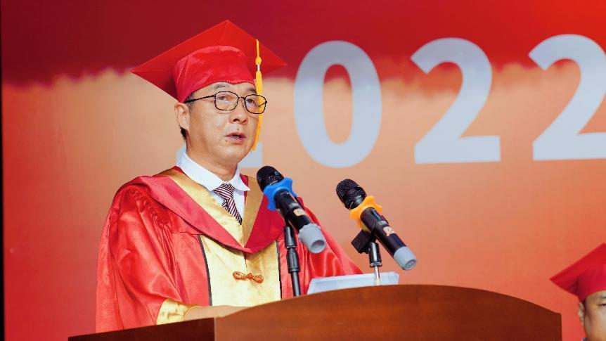 校长邵必林发表了饱含温情、富有哲理的讲话。他首先对2022届毕业生圆满完成学业表示了衷心的祝贺,并对在校期间同学们取得的成绩表示了肯定和感谢。随后他对毕业生提出了四点希望:一是要崇德修身,做德才兼备的新青年。希冀毕业生们在今后的人生中,自觉加强品德修养,做崇德向善的表率、做遵规守纪的模范,明大德、守公德、严私德,严格遵纪守法,努力成为社会主义核心价值观的模范践行者。二是要坚毅自信,做实干有为的新青年。勉励同学们始终把迎接挑战作为人生和生活的常态,在保持坚毅自信的同时,立大志、明大德、成大才、担大任,躬行实践、持之以恒,在脚踏实地、务实笃行中找准定位;在勤勉工作、拼搏进取中成功逐梦,努力成为堪当民族复兴重任的时代新人。三是要求真务实,做追求卓越的新青年。希望同学们始终把追求卓越作为工作和生活的习惯,秉承“厚德博学”的校训和“勤学善思”的学风,始终树立终身学习的品格,不好高骛远,不浅尝辄止,时刻保持进取之心,矢志不渝地融入国家发展大势,努力成为中华民族伟大复兴中国梦的参与者、推动者和奉献者,努力镌刻彰显自身价值的时代丰碑。四是要心怀感恩,做行稳致远的新青年。期望同学们常怀感恩,才会大度平和,更为豁达开朗。心怀感恩,我们才能历久弥坚,行稳致远,谱写人生华章。