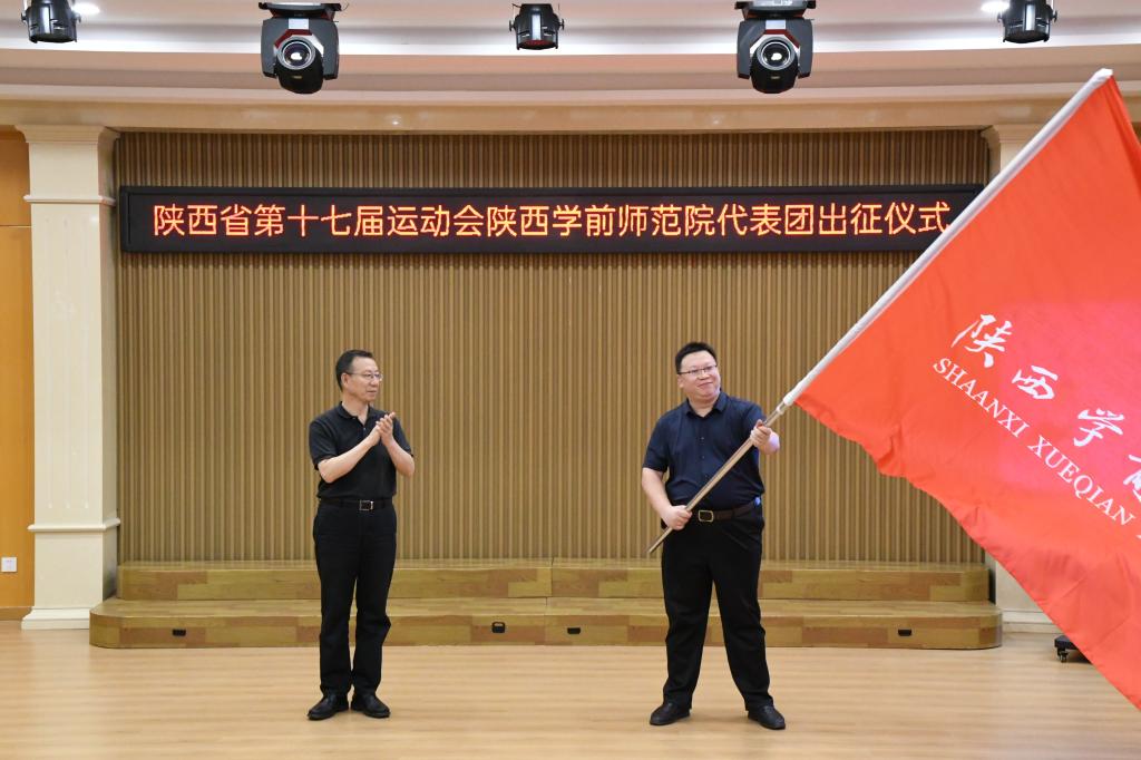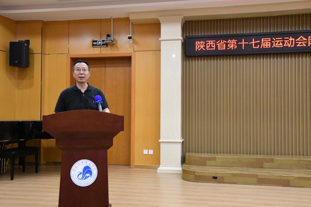 7月18日下午,Beat365官方网站参加陕西省第十七届运动会代表团出征仪式在大学生艺术中心举行。校党委书记付建成,党政办、教务处、体育学院等单位领导以及各运动代表队领队、教练员和运动员参加了出征仪式。出征仪式由体育学院党委副书记(主持工作)王伟主持。