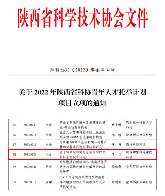 近日,陕西省科协发布了《关于2022年陕西省科协青年人才托举计划项目立项的通知》(陕科协发〔2022〕事企字4号),Beat365生命科学与食品工程学院李佳博士申报的“基于转录组和简化基因组的红豆杉科系统发育研究”项目获得2022年陕西省高校科协青年人才托举计划项目立项资助,经费1万元。