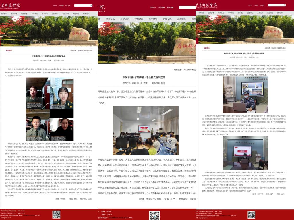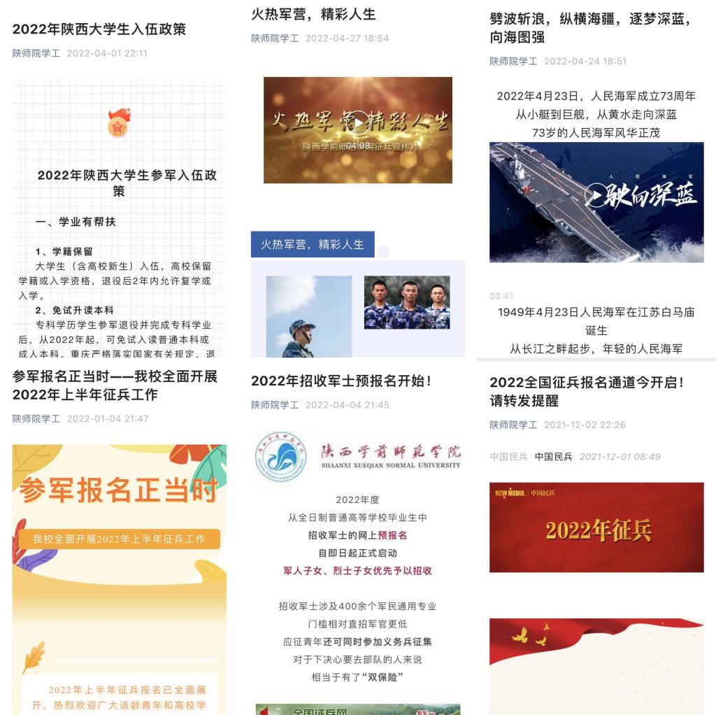 征兵宣传全方位。为充分发挥好“新媒体矩阵”宣传辐射优势,学校采用多种新媒体宣传平台发布征兵相关政策和工作动态,点对点向全校每一位毕业生推送征兵报名通知、征兵报名流程、征兵政策解读等;通过校园网、微信公众号、校园广播、电子显示屏等进行征兵宣传,在校园醒目位置张贴宣传海报和条幅,印制发放《Beat365官方网站征兵宣传手册》等;筹划制作了征兵宣传片《我们在军营等你》,并被陕西省征兵办公室官方平台头版头条转发,全方位、立体化进行征兵宣传,营造参军入伍的浓厚氛围。