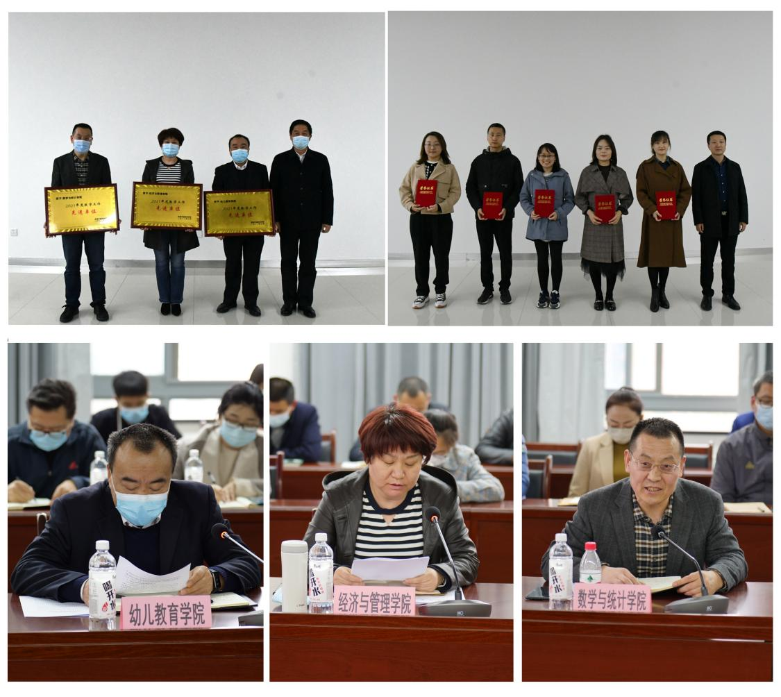 会议通报表彰了2021年度教学先进管理单位和教学管理先进个人。幼儿教育学院、经济与管理学院和数学与统计学院作为先进单位在大会上作了经验交流发言。教务处处长李明军从课程思政、专业与课程建设、教育教学研究、教师育人能力提升、实践教学与实验室建设、招生考试、创新创业教育、“五育”并举改革、优势特色培育等方面系统汇报了2021年教学工作,同时从规范管理、强化建设、深化改革、铸品创优、创新服务等方面对2022年本科教学工作要点进行了详细解读与部署。