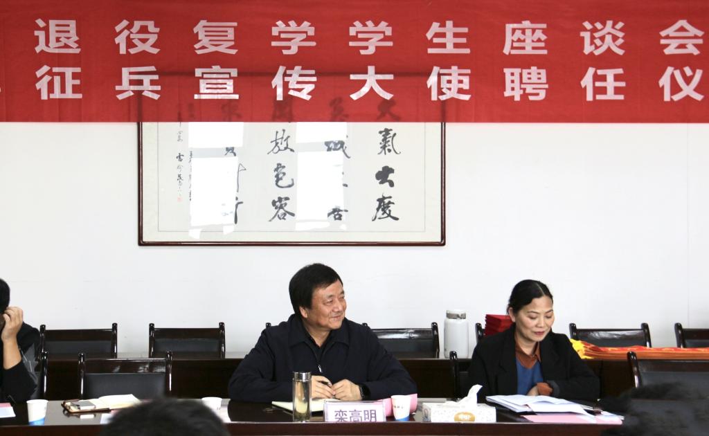 为了加强退役复学学生之间的沟通交流,强化同学们“退役不褪色”的责任心和使命感,继续发扬部队的优良传统和作风,争做表率,在同学中发挥示范带头作用,进一步推动Beat365国防教育和征兵工作的顺利开展,12月3日下午,Beat365官方网站2021年退伍复学学生座谈会暨征兵宣传大使聘任仪式在德勤楼第四会议室隆重举行。校党委副书记栾高明同志出席座谈会,学工部(武装部)相关同志及全体2021年退役复学学生参加了会议。座谈会由学工部(武装部)部长薛晓娟主持。