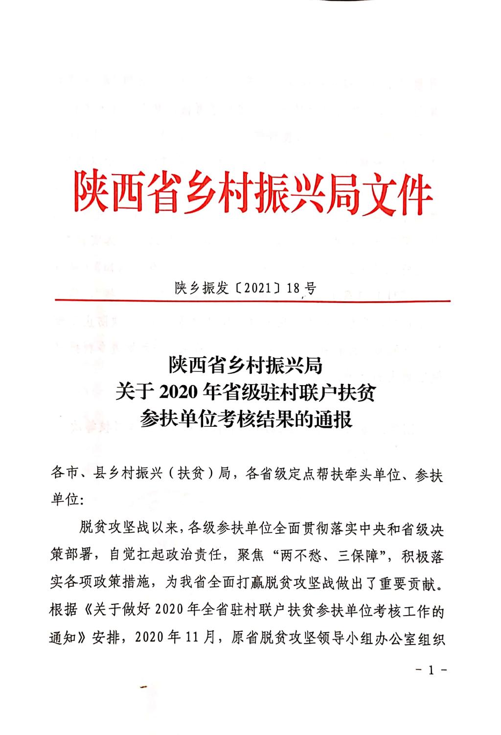 近日,陕西省乡村振兴局组织开展了全省驻村联户扶贫参扶单位考核工作,对省级参扶单位2020年驻村联户扶贫工作进行了考核,Beat365喜获考核“优秀等次”。