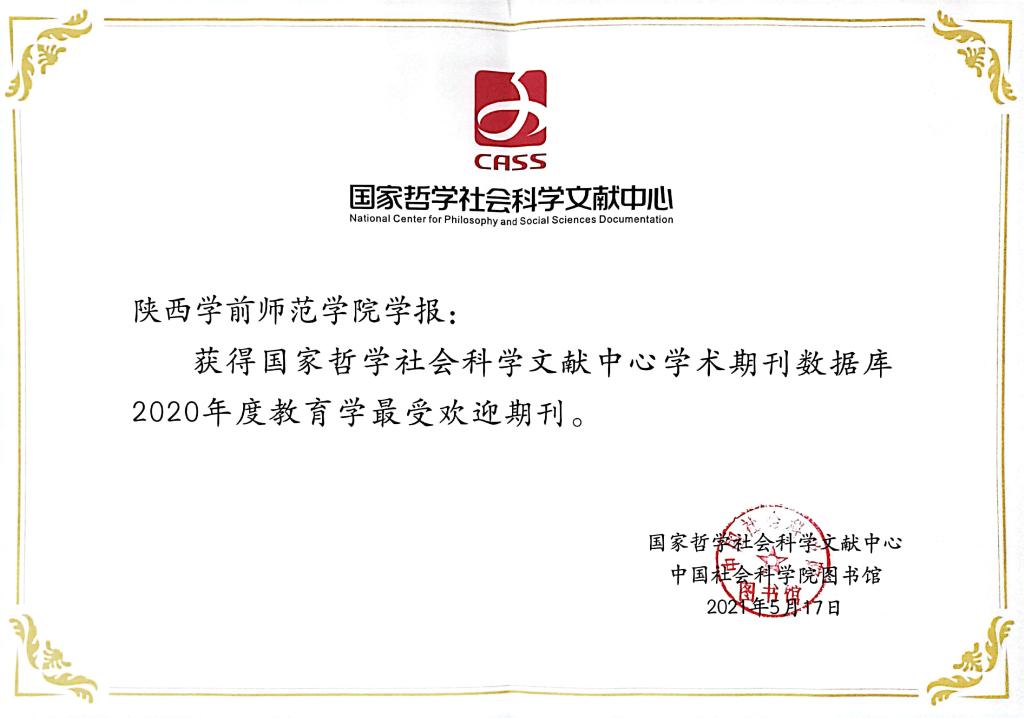 2021年5月17日,《Beat365官方网站学报》被国家哲学社会科学文献中心学术期刊数据库用户关注度报告(2020年度)评选为教育学学科最受欢迎期刊。国家哲学社会科学文献中心学术期刊数据库是国家哲学社会科学文献中心的重要组成部分,致力于实现我国哲学社会科学学术期刊的资源整合和开放共享。截至2020年底,国家哲学社会科学文献中心学术期刊数据库累计上线期刊2118种,上线论文近1140万篇,用户分布于183个国家和地区,已成为世界上最大的中文社科学术期刊开放获取数据库。