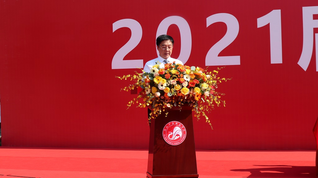 校长邵必林发表了饱含温情、富有哲理的讲话。他首先对2021届毕业生圆满完成学业表示了衷心的祝贺,并对在校期间同学们取得的成绩表示了肯定和感谢。随后他对毕业生提出了五点希望:一是要胸怀祖国,担起民族复兴重任;希望同学们无论身处何时、何地,无论身处人生什么阶段、何种岗位,都能始终坚守爱国情怀,践行对国家的责任和对民族的担当。二是要心怀梦想,做时代的追梦者圆梦人;希望同学们自觉把个人理想与国家的前途、民族的命运紧密相连,时刻牢记对党、对祖国、对人民、对历史的责任,努力实现中华民族伟大复兴中国梦;三是要勤勉务实,以实干笃定前行;把个人理想抱负融入祖国发展的历史洪流中去。在今后的学习、生活和工作中,不好高骛远、贪图虚名、诚实做人、勤勉做事,把工作当事业、把任务当使命;四是要格物致知,矢志追求卓越;希望同学们要始终保持只争朝夕的进取之心,严格践行母校长期铸就的“一训三风”和“立身传道,自强不息,大气大度,止于至善”的精神追求,树立终身学习的可贵品格,求真知,悟真谛,促升华;五是要心存“四心”,行稳致远进而有为;希望同学们能够审慎思考当下与长远、个人与时代之间的关系,秉持师院人质朴诚信、求真务实的传统,深怀一颗爱国心、敬畏心、平常心、进取心,做新时代的有为青年,谱写人生华章。他强调,今年是中国共产党成立100周年,作为陕师院毕业生,与国家共担当、与时代同前行,是追求职业理想、实现人生价值的必然选择。新时代的师院人必须登高,要坚持心怀科学梦想、树立创新志向、不断用新思想突破旧观念,在服务国家发展建设的大局中实现人生价值。