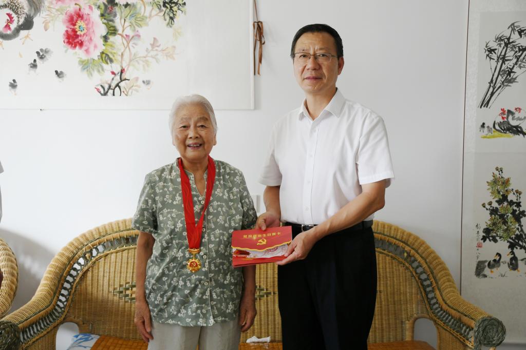 在老党员家中,校领导关切地询问了离退休老党员、老同志的身体健康状况,就学校工作与他们进行了交流,听取了老党员、老同志对学校改革发展的意见建议,并对他们为党的事业和学校建设发展所做出的积极贡献表示感谢。校领导为老党员佩戴了“光荣在党50年”纪念章,并送上慰问金、慰问品和政治生日贺卡。