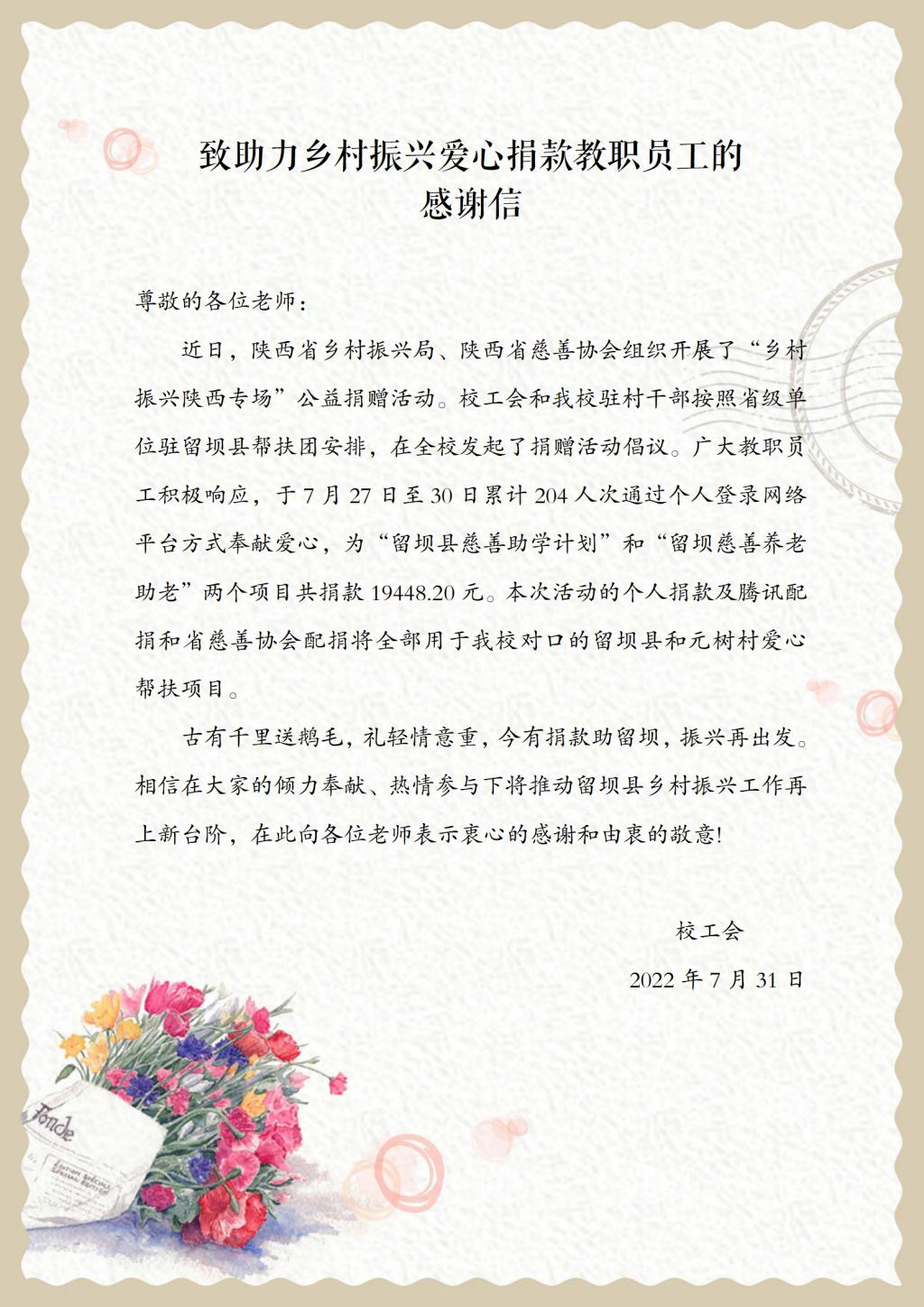 下一条:致助力乡村振兴爱心捐款教职员工的感谢信