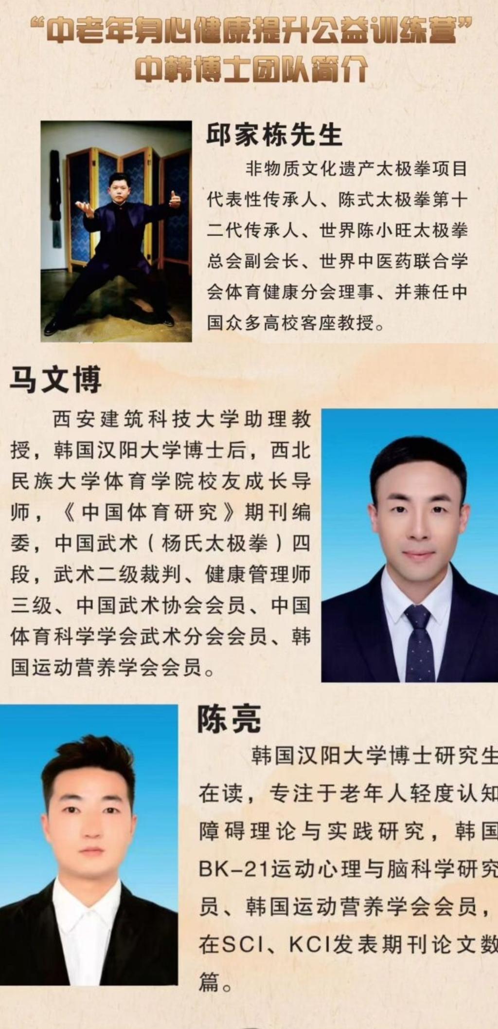 在当天上午的首次活动中,训练营项目导师、国家非物质文化遗产太极拳项目代表性传承人邱家栋博士首先介绍了学习陈氏太极拳的注意事项,随后,邱博士带领老同志们认真教授了12式陈氏太极拳的基本动作和套路。训练结束后,团队导师马文博博士、陈亮博士为参加活动的老同志进行了身心机能、肌肉力量及认知能力检测。按照训练营既定计划,团队将依照检测数据在之后的训练中为每位参加活动的老同志量身定制个性化健康管理方案和运动处方。