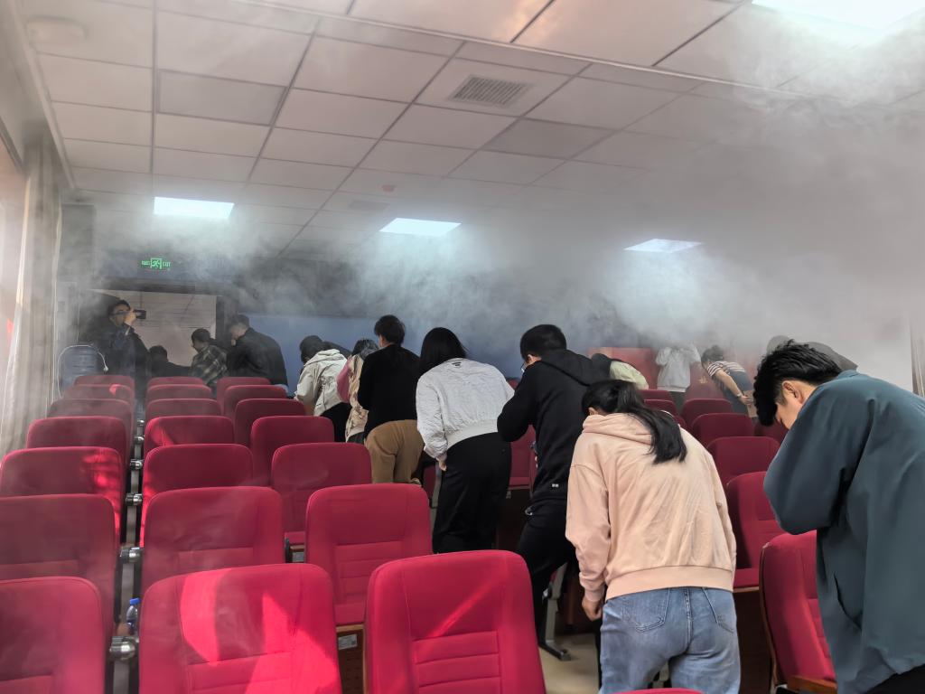 接着,杨教官组织大家进行消防应急疏散演练。现场设置了烟雾弹模拟火灾,以托育大楼为例模拟发生火灾,大家弯腰匍匐前进,捂住口鼻快速有序撤离火场至安全地点。疏散过程中,大家动作迅速,没有拥挤、争抢现象,体现了良好的安全意识和快速反应能力。