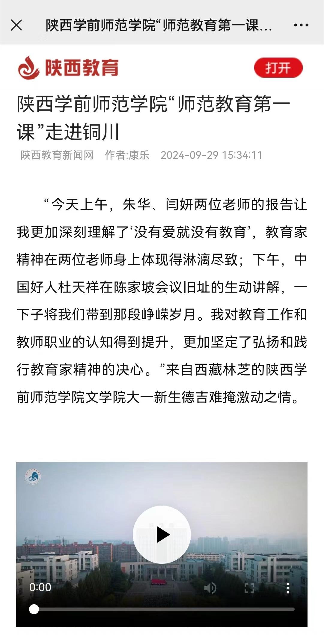 为贯彻落实《中共中央 国务院关于弘扬教育家精神加强新时代高素质专业化教师队伍建设的意见》文件精神,将教育家精神培育涵养融入示范市培养全过程,9月27日,文学院组织2024级全体新生赴陕西省铜川市开展“师范教育第一课”活动。文学院党委书记赵淼、院长牛文明、新生辅导员康乐及赵录旺、张珊珊、蒲怡囡等老师参与此次活动。