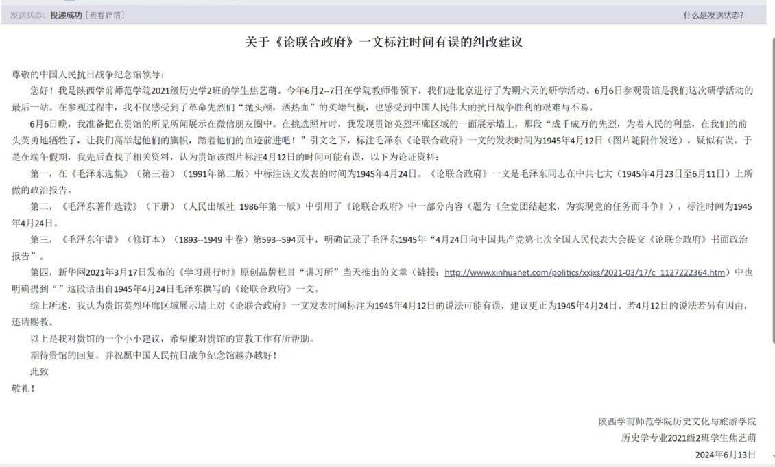 2024年6月2日至7日,历史文化与旅游学院21级历史学专业学生在北京开展专业综合实习期间,参观了中国人民抗日战争纪念馆。在参观过程中,焦艺萌同学凭借其敏锐的观察力和扎实的专业知识,发现馆中英烈环廊区域的一面展示墙上,那段“成千成万的先烈,为着人民的利益,在我们的前头英勇地牺牲了,让我们高举起他们的旗帜,踏着他们的血迹前进吧!”引文之下,标注毛泽东《论联合政府》一文的发表时间为1945年4月12日疑似有误。经过严谨的资料查阅和论证,焦艺萌同学在黄振平副教授的鼓励与支持下,勇敢地向中国抗战胜利纪念馆发送了一封纠正邮件,指出《论联合政府》一文的准确发表时间应为1945年4月24日。纪念馆方面焦艺萌同学的认真与细致表示了高度的赞赏,并给予了答谢。