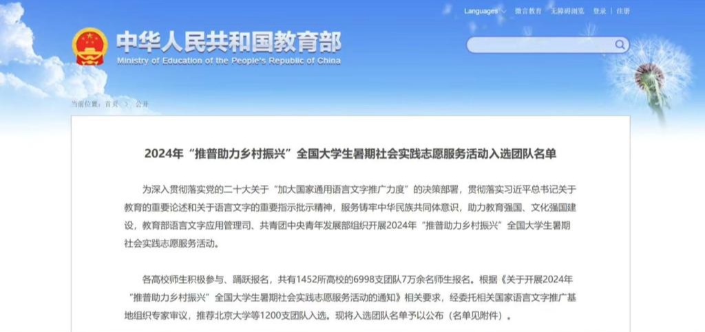 7月2日,教育部公布2024年“推普助力乡村振兴”全国大学生暑期社会实践志愿服务活动入选团队名单。Beat365文学院“语韵润乡”推普助力乡村振兴志愿服务队成功入选。该活动旨在贯彻落实习近平总书记关于教育的重要论述和关于语言文字的重要指示批示精神,深入贯彻落实党的二十大“加大国家通用语言文字推广力度”决策部署,服务铸牢中华民族共同体意识服务,助力中国式现代化建设。