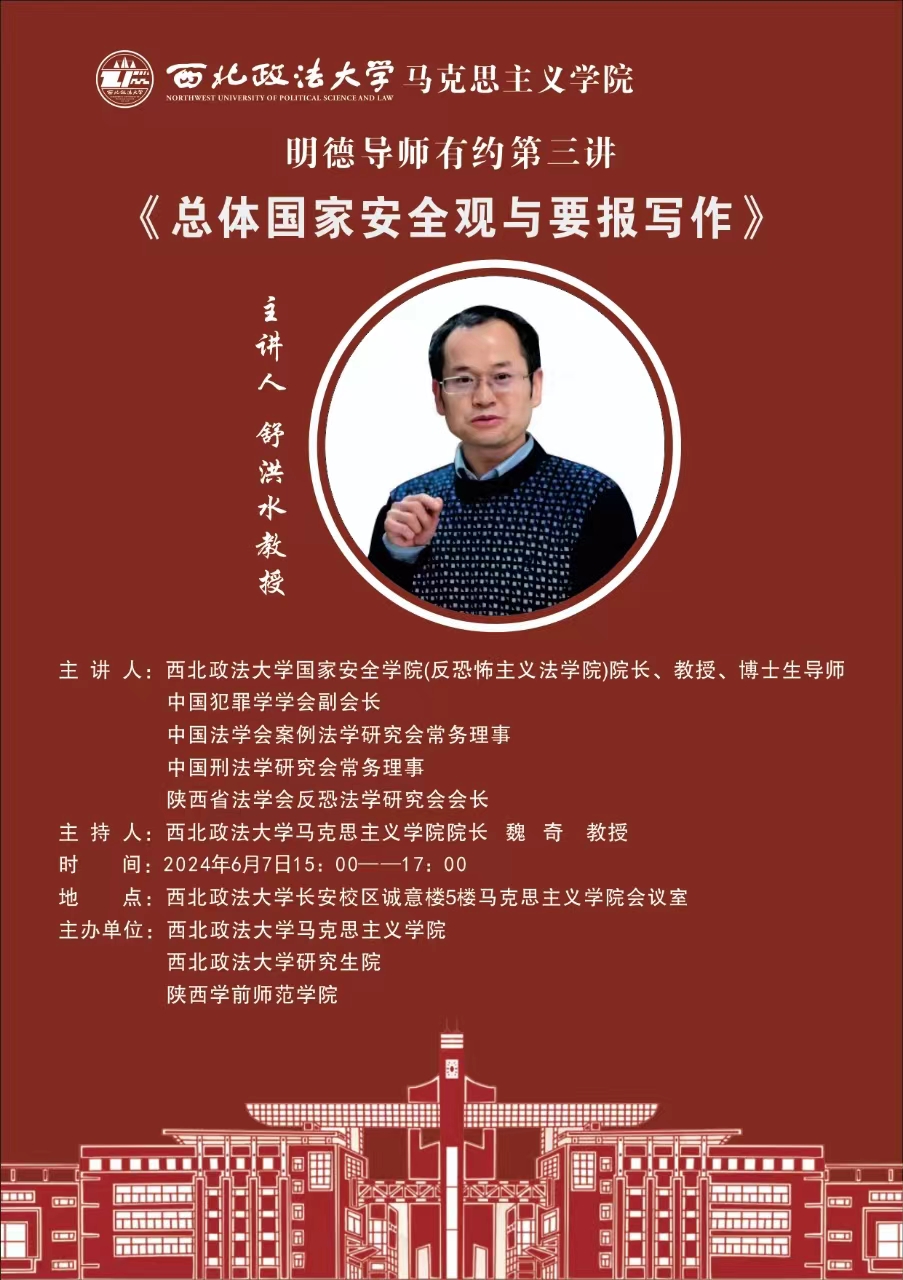6月7日下午,Beat365马克思主义学院与西北政法马克思主义学院共同主办明德导师有约第三讲。西北政法大学国家安全学院院长、中国犯罪学会副会长、中国法学会案例法学研究会常务理事、中国刑法学研究会常务理事、陕西省法学会反恐法学研究会会长舒洪水教授作了《总体国家安全观与要报写作》的讲座。本次讲座在西北政法大学长安校区5号楼518进行。讲座由西北政法大学马克思主义学院魏奇院长主持,西北政法大学马克思主义学院研究生和Beat365马克思主义学院教研室主任和部分老师参加。