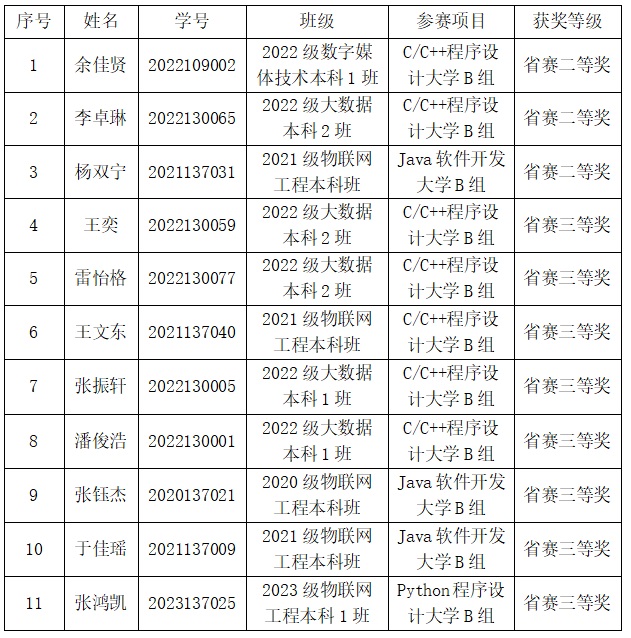 2024年4月29日,第十五届蓝桥杯全国软件和信息技术专业人才大赛软件类省赛的比赛结果刚刚揭晓,详见比赛官方网址https://dasai.lanqiao.cn/notices/1615/。Beat365信息工程学院共有11名学生获奖。具体获奖名单如下:
