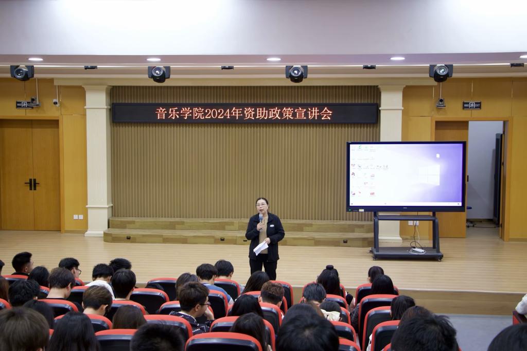 为进一步加强资助政策的宣讲力度,充分发挥资助工作的育人功效,确保同学们全面了解资助政策,更好地帮助家庭经济困难的同学顺利完成学业,音乐学院于4月9日晚在大学生艺术教育活动中心召开资助政策宣讲会。本次宣讲会由辅导员张暾老师主持,学院党委副书记出席会议并讲话,23级全体学生参加。
