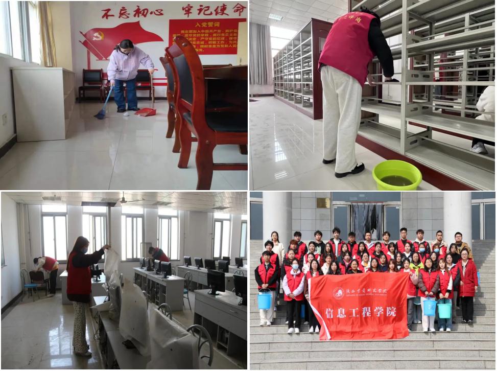 三、以志愿服务为升华,在奉献中彰显劳动价值。团学组织及学生社团积极组织信工学子进社区,进图书馆、实验室和机房,进党员活动室开展义务劳动。在校内义务劳动过程中,同学们饱含热情,积极投入到清扫活动中,细致擦拭桌椅窗台,认真打扫地面灰尘,耐心整理图册书籍,认真检查,不留死角,将图书馆、机房与党员活动室等公共区域打扫干净,为师生提供了干净明亮的工作学习环境。